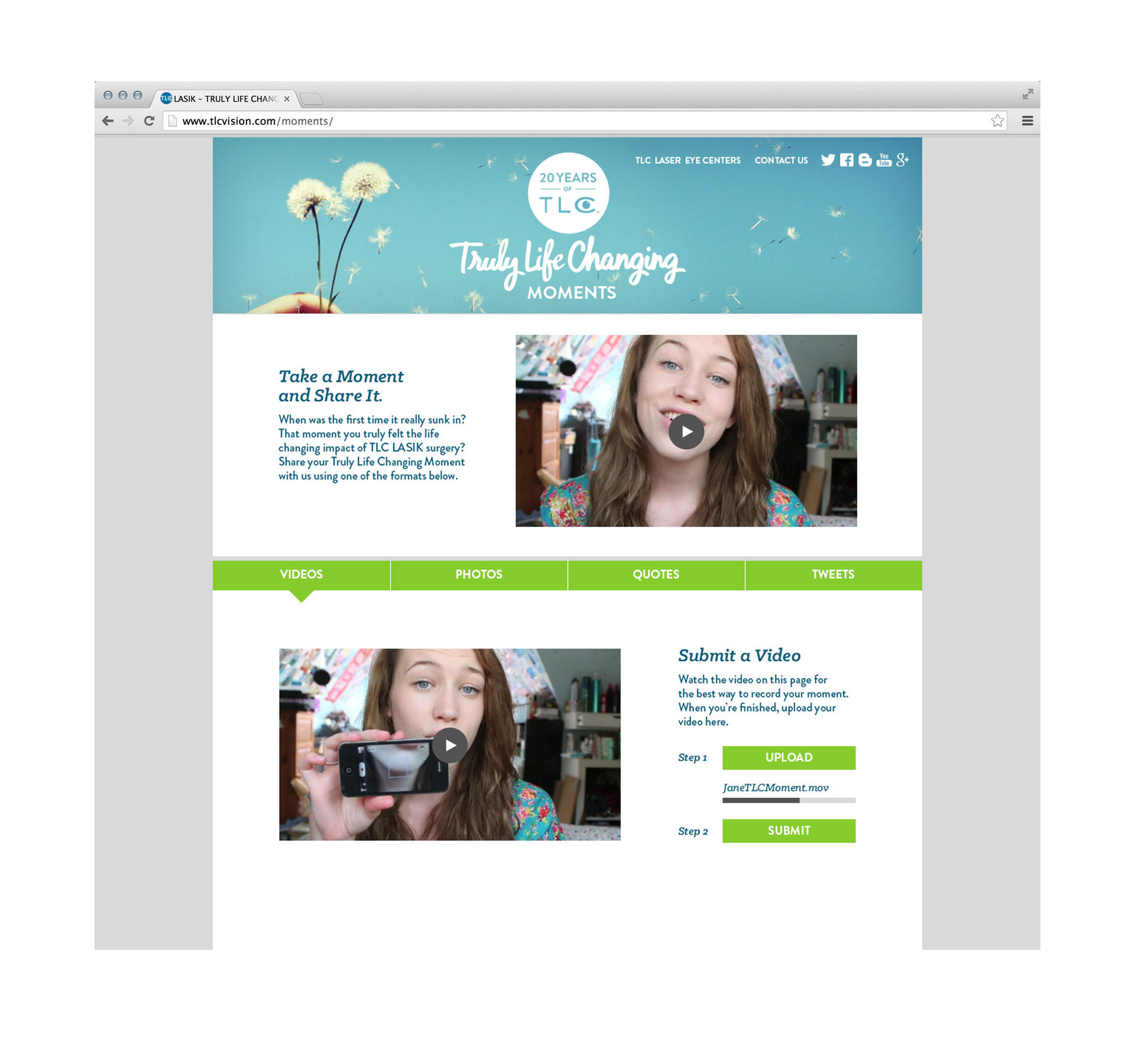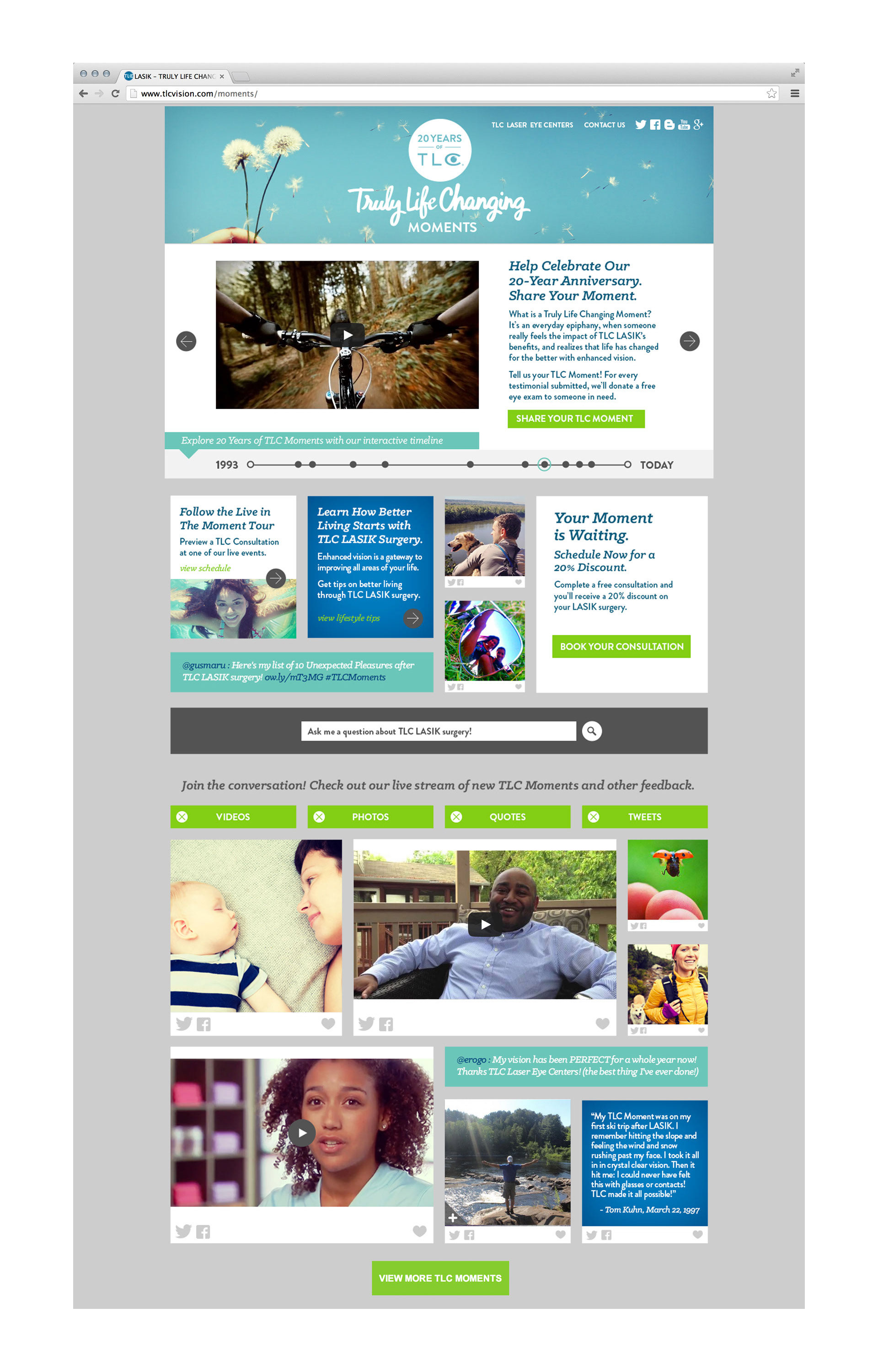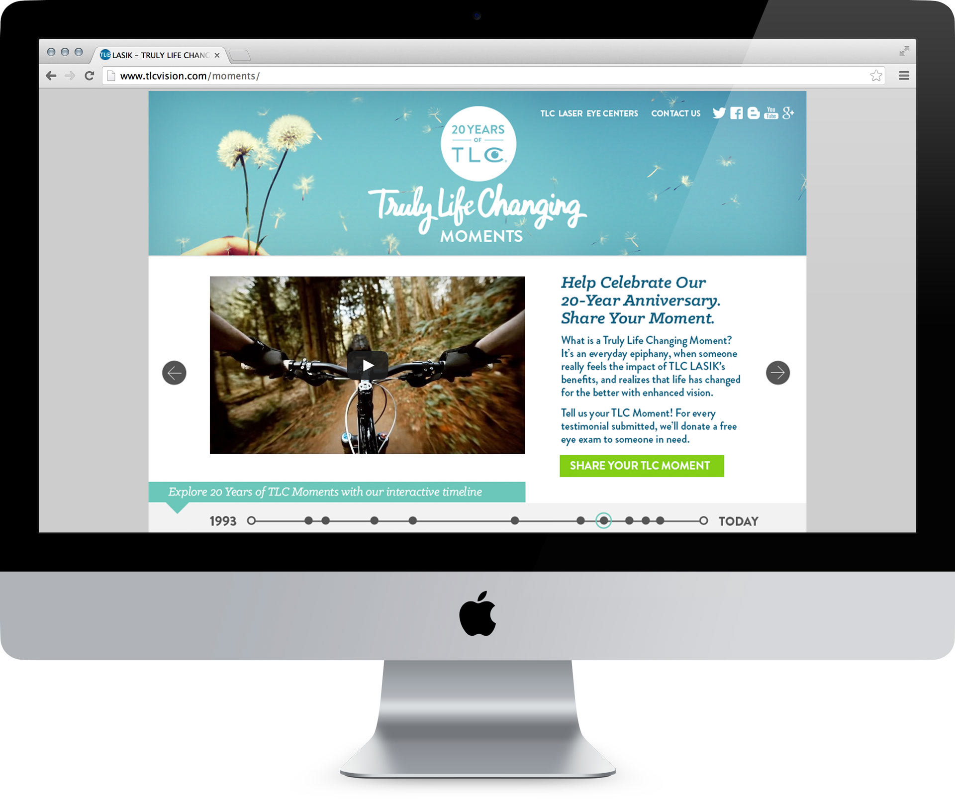 In 2013, TLC Laser Eye Centers celebrated their 20th year of business and celebrated with a campaign highlighting the moments of discovery and joy experienced by their patients following corrective eye surgery. TLC patients were asked to share their "TLC Moments" on social media and directly on the microsite and all participants were entered into a sweepstakes. The campaign included a TLC Moments microsite, promo banner to direct traffic from the parent site, TLCVision.com and support materials for display in TLC and partner-run clinics to promote the campaign. I created the theme graphic, initial microsite concept and visual design, storyboard for the HTML5-animated promo banner and support print materials.